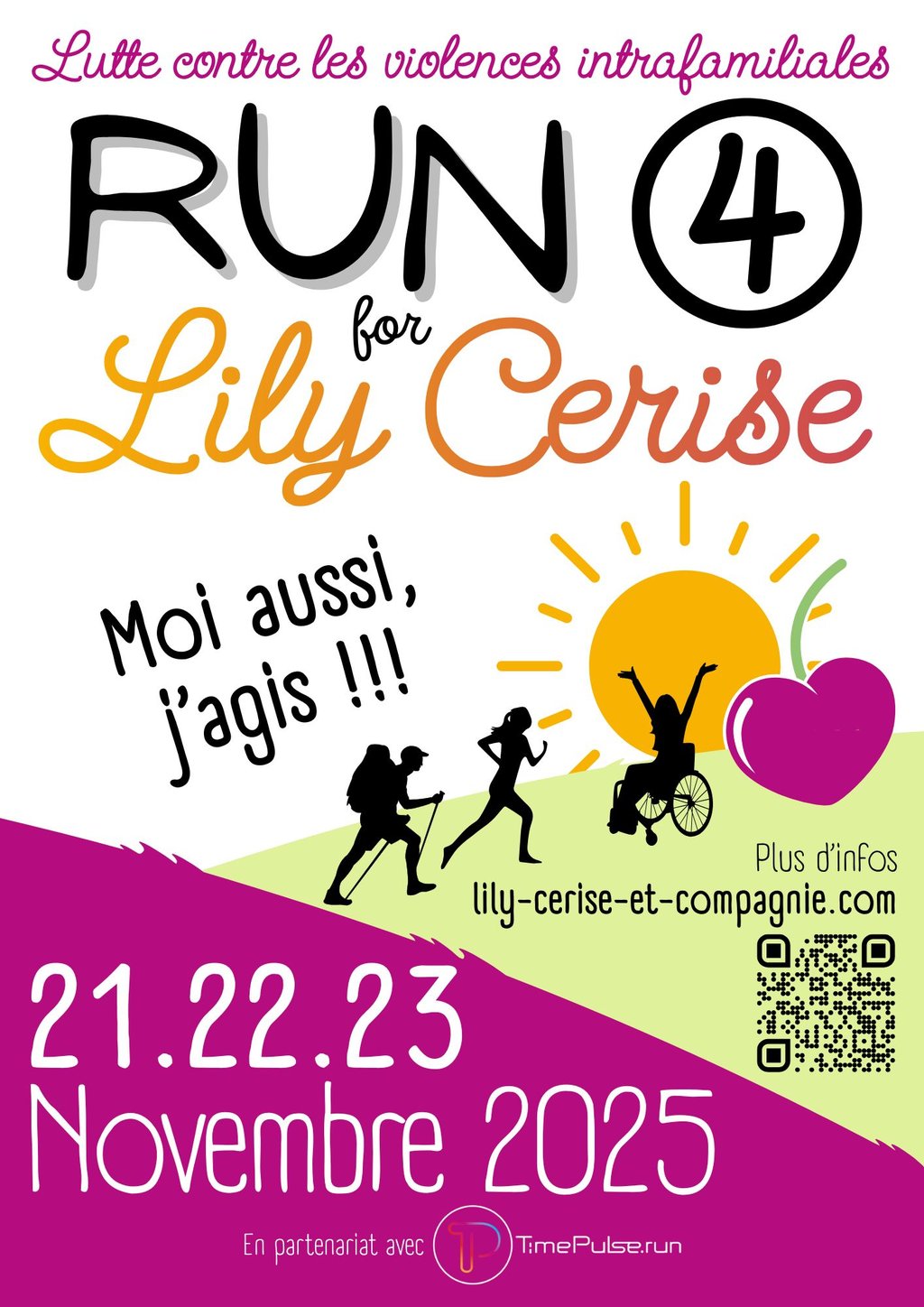 Lily Cerise & Cie, association d'information et de lutte contre les violences intrafamiliales du Pays d'Ancenis, reconduit pour la quatrième année consécutive sa "Run for Lily Cerise". Il s'agit d'un course connectée qui peut se courir de n'importe où, le week-end du 21 au 23 novembre 2025 à l'occasion de la journée internationale de lutte contre les violences faites aux femmes (25 novembre). Seuls, en famille, entre collègues ou entre amis, passez un bon moment à marcher ou courir pour la bonne cause !