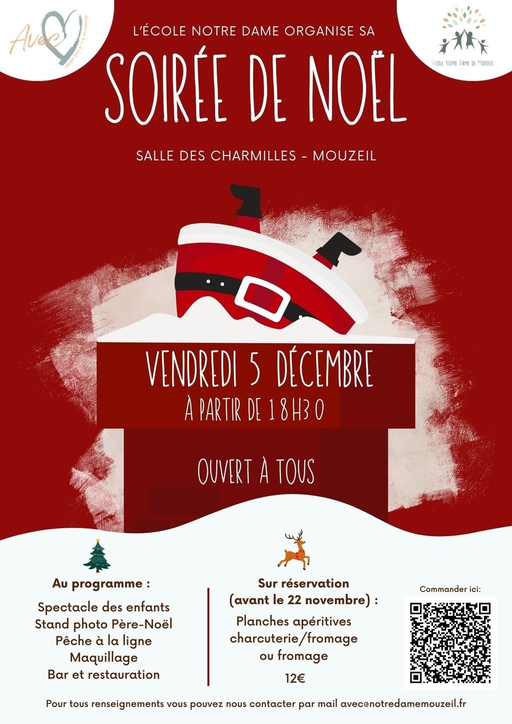 Celles-ci sont à réserver avant le 22 Novembre et seront à consommer sur place. (via hello asso https://www.helloasso.com/associations/association-pour-la-vie-de-l-ecole-catholique/boutiques/soiree-de-noel-2025-planches-aperitives ou bon de commande papier)