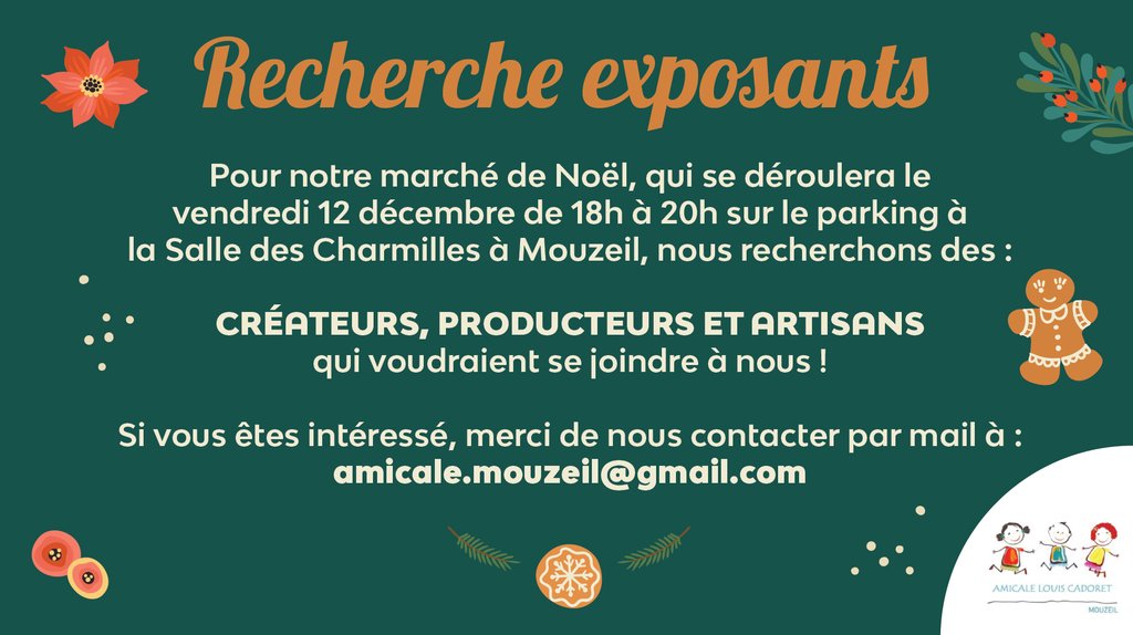 Pour notre marché de Noël, qui se déroulera le vendredi 12 décembre de 18h à 20h à la Salle des Charmilles de Mouzeil, nous recherchons :