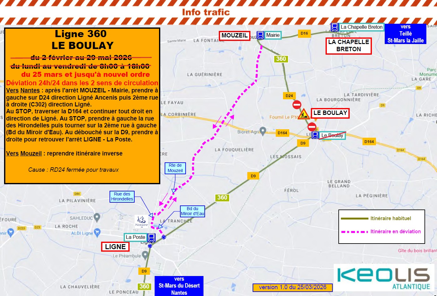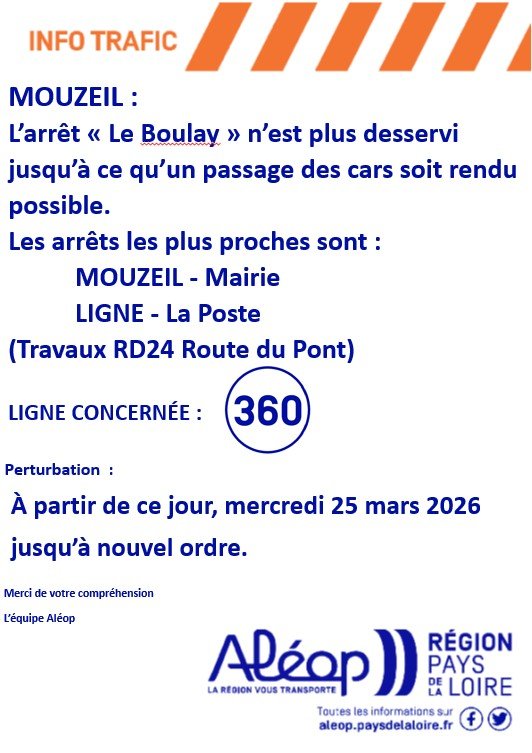 A partir du 25 mars, et jusqu'à nouvel ordre, l’arrêt MOUZEIL - Le Boulay ne sera pas desservi dans les 2 sens de circulation 24h/24, 7j/7