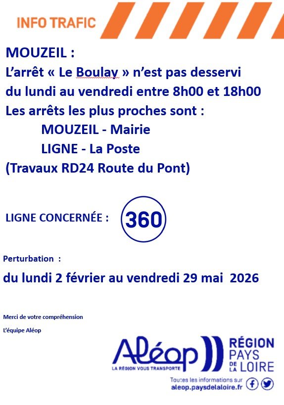 En effet, du 2 février au 29 mai, l’arrêt MOUZEIL-Le Boulay ne sera pas desservi dans les 2 sens de circulation entre 8h00 et 18h00 du lundi au vendredi. (Les autres arrêts de la ligne ne sont pas impactés)